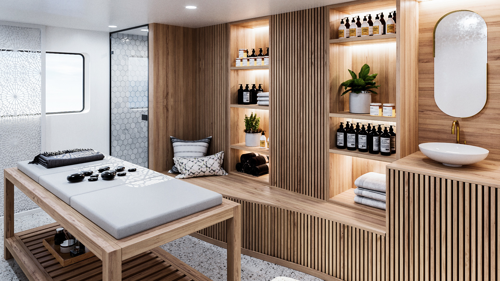 Our signature SPA-ROSA will be bigger and better than ever. Expect a Finnish sauna, jacuzzi, two treatment rooms and even an ice grotto with ice fountain. An expanded fitness room will offer up premium machines with smart tech, plus space for group sessions, including yoga. Refuel at the self-service bar or choose to snuggle up in the relaxation room with comfy loungers and a fireplace.